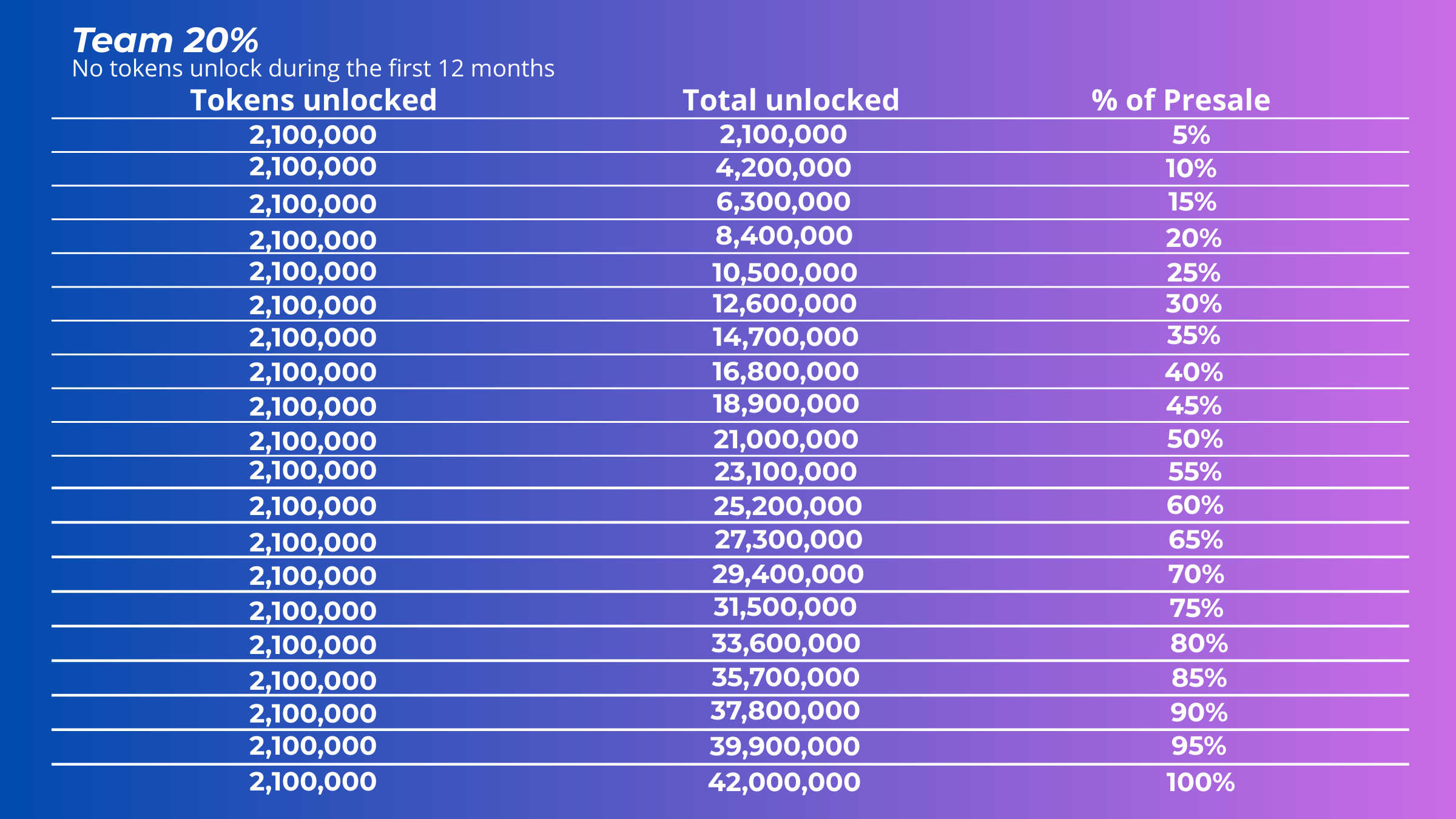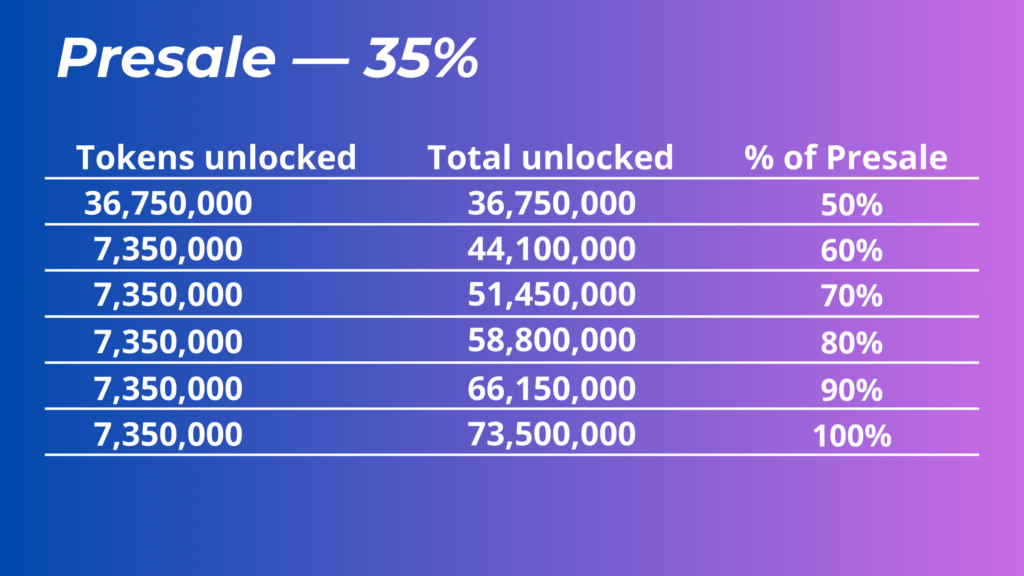 Presale – 35% All IDO participants receive their tokens immediately after the IDO concludes, with 50% unlocked at launch and the remaining 50% gradually released in 20% monthly installments over five months. This system reduces the risk of sudden sell-offs, enhances transparency and investor trust, encourages long-term engagement with the project, and contributes to token market stability.