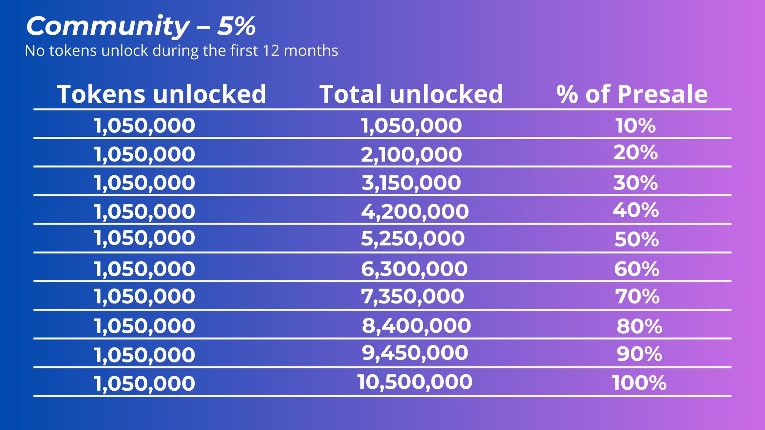 Community – 5% This allocation is dedicated to long-term community growth and strategic development, incentivizing user participation through a chat roulette system to support the training of AI sign language models across multiple dialects. To ensure sustainable ecosystem development and mitigate market pressure, all tokens are subject to a 12-month lock-up, followed by a linear monthly vesting of 10% until fully unlocked.